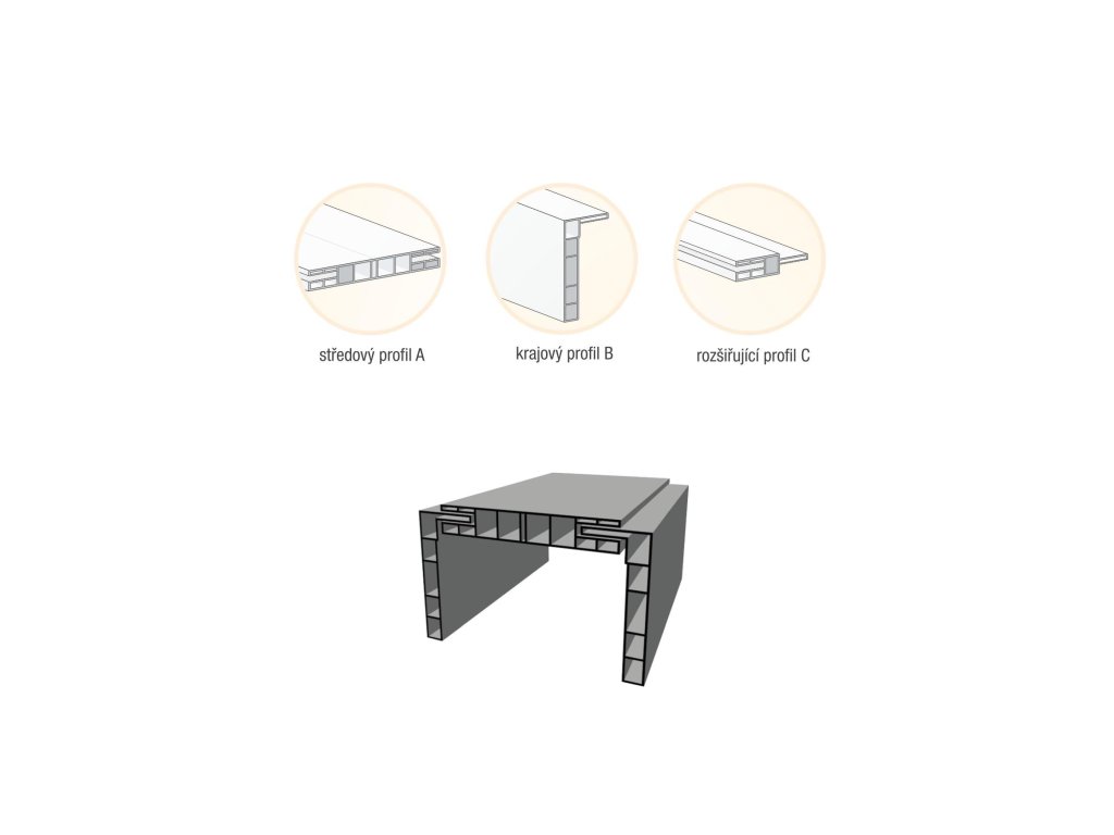 The standard size of the cladding is 110 × 220cm, this size covers a frame or wall 9 to 11 cm wide. During installation, the width of the structural opening is reduced by 1.4 cm on each side. If the wall thickness is greater than 11 cm, extension profiles can be used to cover walls up to 23 cm thick (see extension profile C). Each extension profile C adds 3 cm. If ordering cladding with a width exceeding 110 cm, another full cladding unit must be used and charged.